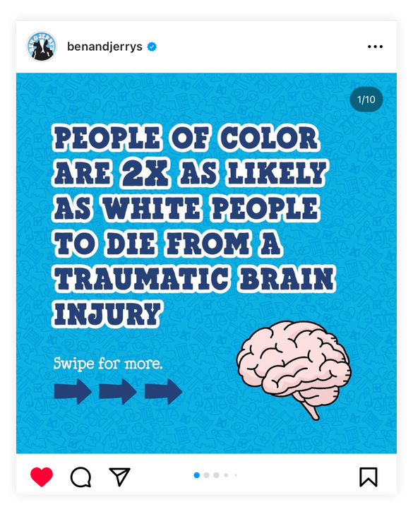 In collaboration with Ben and Jerry’s, we raised significant awareness about the intersection of TBI and BIPOC communities, reaching and educating 13,000+ people, and gathering available research and data on BIPOC health disparities related to brain health.